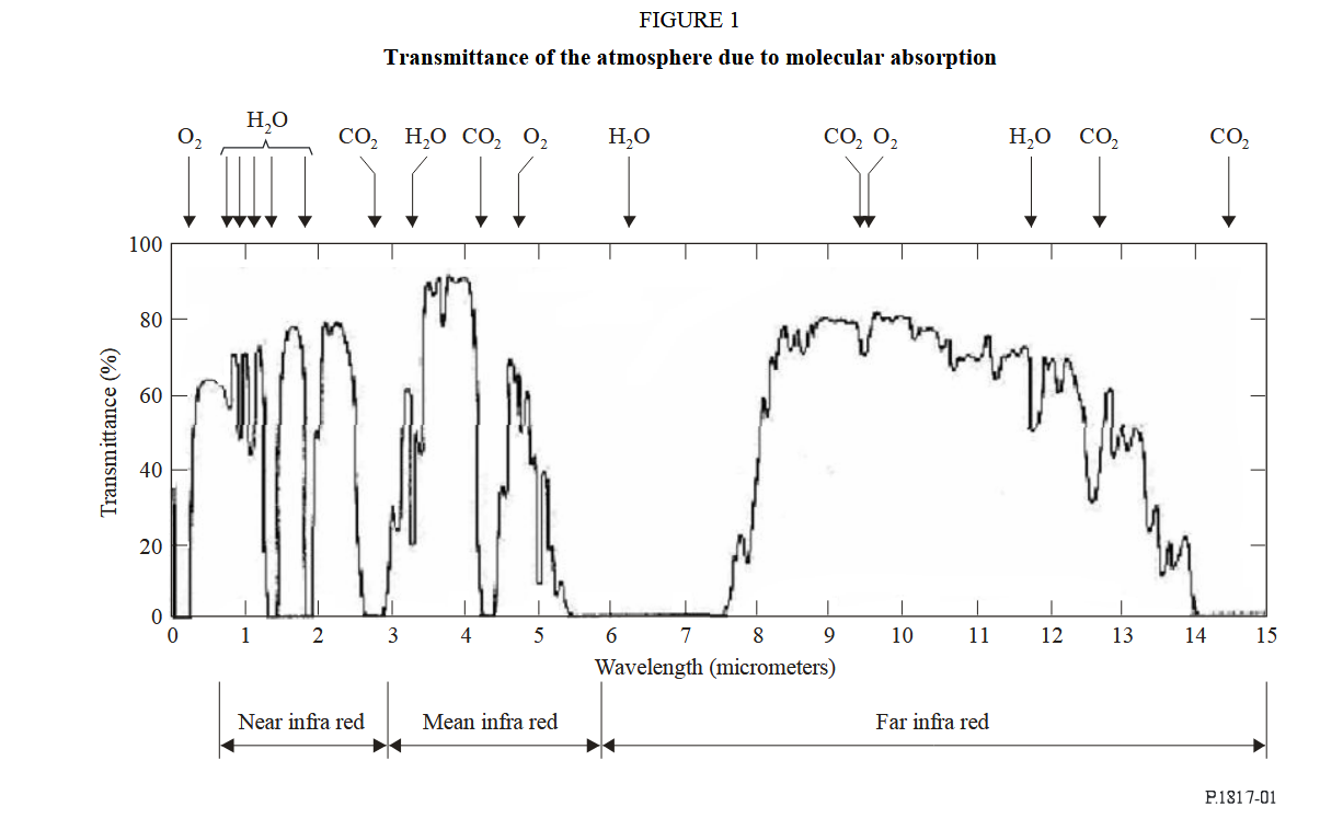 Once again, we see a peak at around as well as , with transmittance at around 70% and 80% respectively, as well as the well-known infrared window between , with transmittance reaching 80% or higher, at least in clear skies.