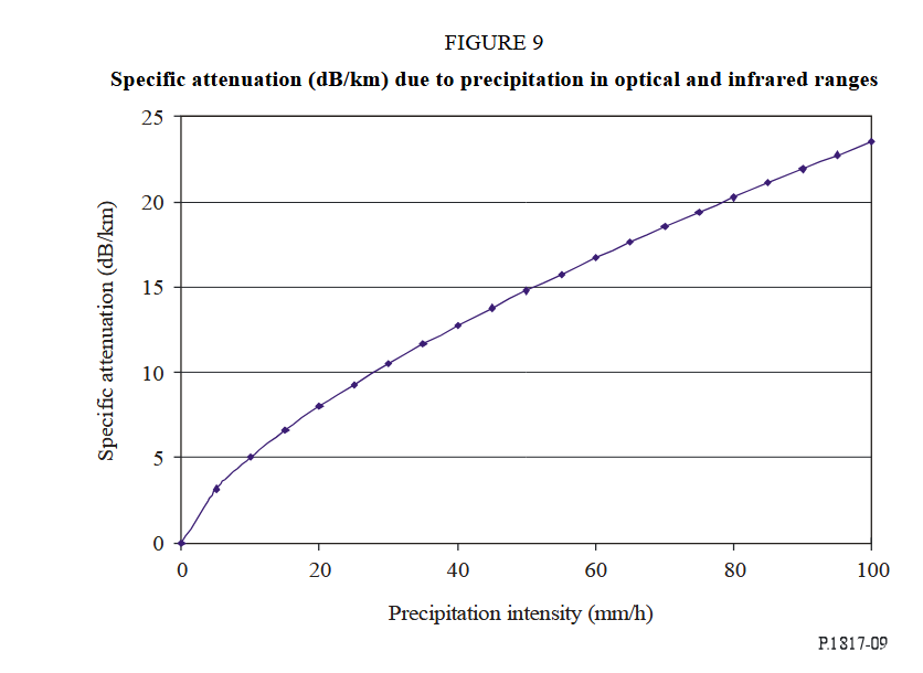 If we compare these values of rain-based attenuation with the following table of rain intensities4, we find that even a small amount of precipitation can greatly increase transmission losses. The total attenuation is effectively 10x the specific attenuation (to account for the 10 km thickness of the troposphere), meaning that in heavy rain, power can be attenuated from 50 dB to over 150 dB, meaning that effectively 100% of the power of the laser beam is lost. This is a serious disadvantage common to nearly the entire infrared range, but it has a solution, which we will discuss later.