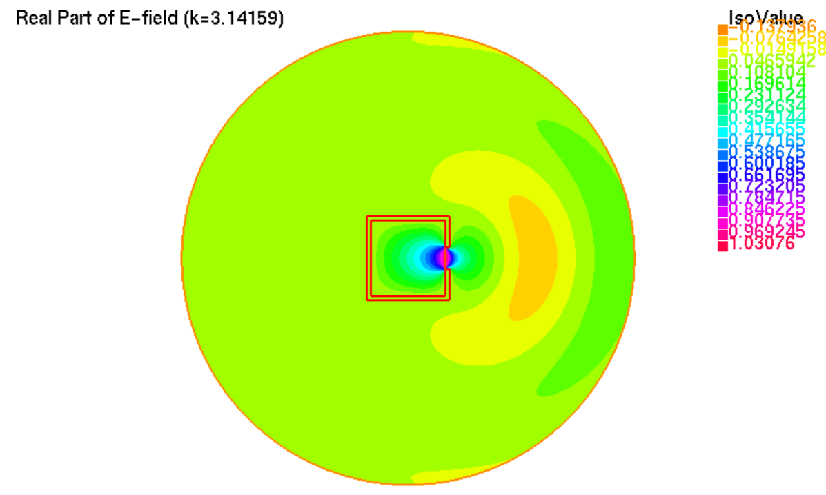The FreeFEM code for the simulation can be found in freefem/dev/lasers/solve-Efield.edp. The result is shown below: